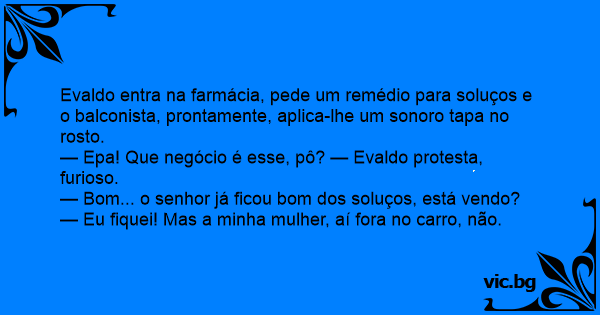 Evaldo entra na farmácia, pede um remédio para soluços e o balconista, prontamente, aplica-lhe um sonoro tapa no rosto.