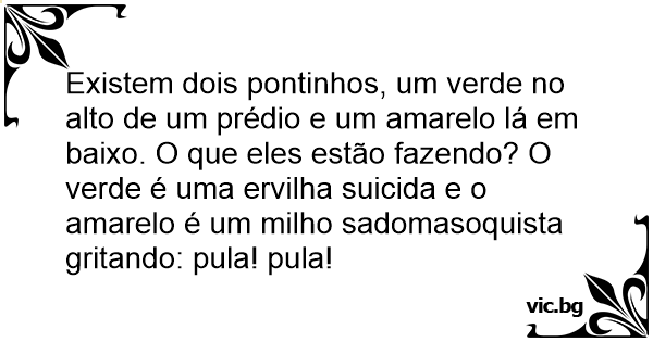 Existem dois pontinhos, um verde no alto de um prédio e um amarelo lá em baixo. O que eles estão fazendo? O verde é uma ervilha suicida e o amarelo é um milho sadomasoquista gritando: pula! pula!