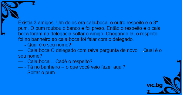 Existia 3 amigos. Um deles era cala-boca, o outro respeito e o 3º pum. O pum roubou o banco e foi preso. Então o respeito e o cala-boca foram na delegacia soltar o amigo. Chegando lá, o respeito foi no banheiro eo cala-boca foi falar com o delegado.