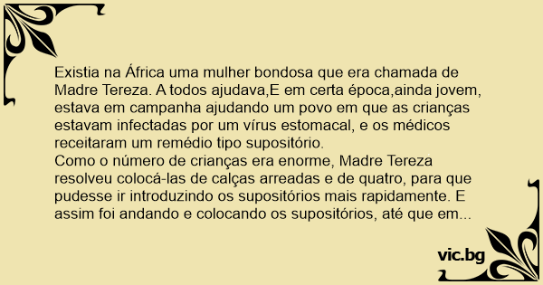 Existia na África uma mulher bondosa que era chamada de Madre Tereza. A todos ajudava,E em certa época,ainda jovem, estava em campanha ajudando um povo em que as crianças estavam infectadas por um vírus estomacal, e os médicos receitaram um remédio tipo supositório.