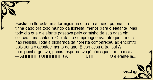 Existia na floresta uma formiguinha que era a maior putona. Já tinha dado pra todo mundo da floresta, menos para o elefante. Mas todo dia que o elefante passava pelo caminho de sua casa ela soltava uma cantada. O elefante sempre ignorava até que um dia não resistiu. Toda a bicharada da floresta compareceu ao encontro pois seria o acontecimento do ano. E começou a transa! A formiguinha gritava, gemia, esperneava já não aguentando mais: