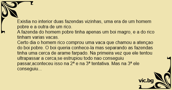 Certo dia o homem rico comprou uma vаса que chamou a atençao do boi pobre. O boi queria conhece-la mas separando as fazendas tinha uma cerca de arame farpado. Na primeira vez que ele tentou ultrapassar a cerca,se estrupiou todo nao conseguiu passar,aconteceu isso na 2ª e na 3ª tentativa. Mas na 3ª ele conseguiu ultrapassar.