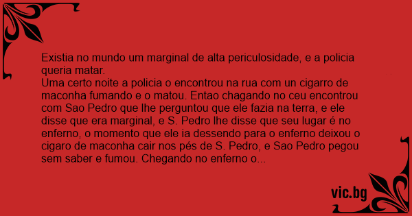 Uma certo noite a policia o encontrou na rua com un cigarro de maconha fumando e o matou. Entao chagando no ceu encontrou com Sao Pedro que lhe perguntou que ele fazia na terra, e ele disse que era marginal, e S. Pedro lhe disse que seu lugar é no enferno, o momento que ele ia dessendo para o enferno deixou o cigaro de maconha cair nos pés de S. Pedro, e Sao Pedro pegou sem saber e fumou. Chegando no enferno o diabo lhe perguntou o que ele fazia na terra e ele respondeu que fumava maconha, entao o diabo o pediu provas, quando ele colocou as maos no bolso para pegar o cigaro de maconha, ele se deu conta que deixou cair la no céu, entao ele retornou la no céu para buscar para provar o diabo que ele fumava maconha, e o diabo o deixasse entrar no enferno. Chagando la no ceu ele bateu na porta e chamou!!! Sao Pe..., Sao Pedro o enterrompeu levantou o dedinho pra cima e disse: Sao Pedro naaaooo PEDRAO!