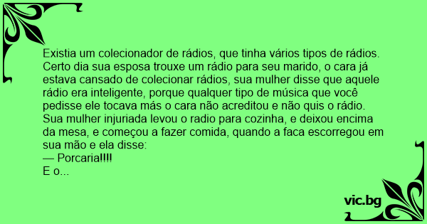 Certo dia sua esposa trouxe um rádio para seu marido, o cara já estava cansado de colecionar rádios, sua mulher disse que aquele rádio era inteligente, porque qualquer tipo de música que você pedisse ele tocava más o cara não acreditou e não quis o rádio.
