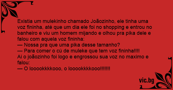Existia um mulekinho chamado Joãozinho, ele tinha uma voz fininha, até que um dia ele foi no shopping e entrou no banheiro e viu um homem mijando e olhou pra pika dele e falou com aquela voz fininha: