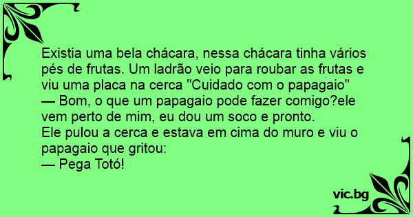 Existia uma bela chácara, nessa chácara tinha vários pés de frutas. Um ladrão veio para roubar as frutas e viu uma placa na cerca "Cuidado com o papagaio"