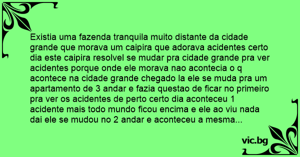 Existia uma fazenda tranquila muito distante da cidade grande que morava um caipira que adorava acidentes certo dia este caipira resolvel se mudar pra cidade grande pra ver acidentes porque onde ele morava nao acontecia o q acontece na cidade grande chegado la ele se muda pra um apartamento de 3 andar e fazia questao de ficar no primeiro pra ver os acidentes de perto certo dia aconteceu 1 acidente mais todo mundo ficou encima e ele ao viu nada dai ele se mudou no 2 andar e aconteceu a mesma coisa ele se mudou pro 3 a mesma coisa entao resolveu pregar uma peça nesse pessoal q nao deixava ele ver aconteceu o acidente e ninguem deixou ele ver dai ele chegou perto fingindo q estava chorando disse da licenlça é meu parente é meu parente chegando la estava um вurrо morto .
