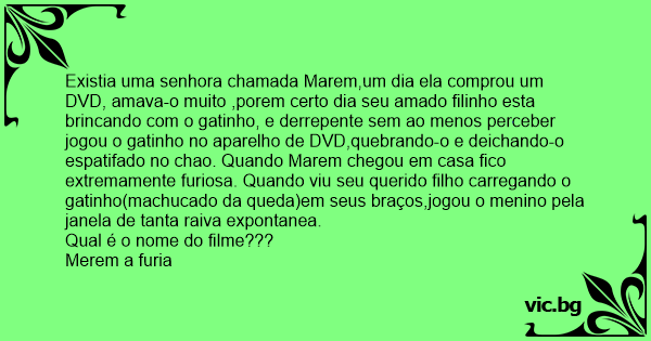 Existia uma senhora chamada Marem,um dia ela comprou um DVD, amava-o muito ,porem certo dia seu amado filinho esta brincando com o gatinho, e derrepente sem ao menos perceber jogou o gatinho no aparelho de DVD,quebrando-o e deichando-o espatifado no chao. Quando Marem chegou em casa fico extremamente furiosa. Quando viu seu querido filho carregando o gatinho(machucado da queda)em seus braços,jogou o menino pela janela de tanta raiva expontanea.