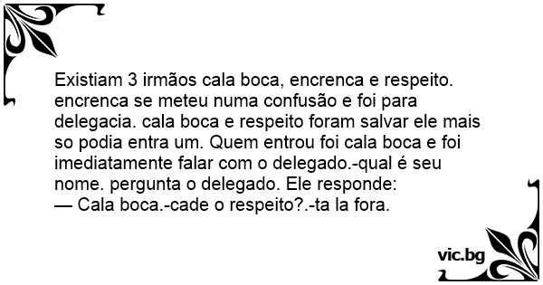 Existiam 3 irmãos cala boca, encrenca e respeito. encrenca se meteu numa confusão e foi para delegacia. cala boca e respeito foram salvar ele mais so podia entra um. Quem entrou foi cala boca e foi imediatamente falar com o delegado.-qual é seu nome. pergunta o delegado. Ele responde: