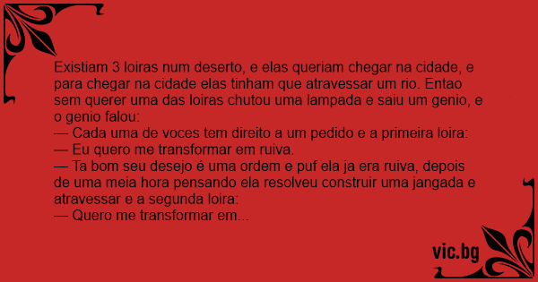 Existiam 3 loiras num deserto, e elas queriam chegar na cidade, e para chegar na cidade elas tinham que atravessar um rio. Entao sem querer uma das loiras chutou uma lampada e saiu um genio, e o genio falou: