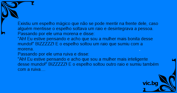 "Ah! Eu estive pensando e acho que sou a mulher mais bonita desse mundo!" BIZZZZZ! E o espelho soltou um raio que sumiu com a morena.