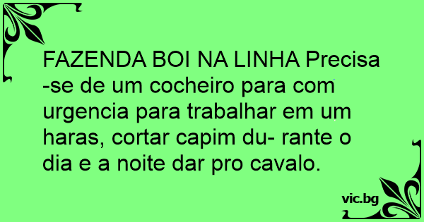FAZENDA BOI NA LINHA Precisa-se de um cocheiro para com urgencia para trabalhar em um haras, cortar capim du- rante o dia e a noite dar pro cavalo.