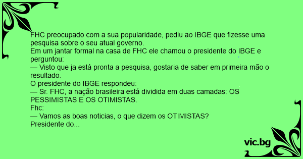 — Sr. FHC, a nação brasileira está dividida em duas camadas: OS PESSIMISTAS E OS OTIMISTAS.
