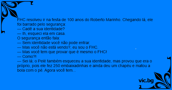 — Sei lá; o Pelé também esqueceu a sua identidade, mas provou que era o próprio, pois ele fez 250 embaixadinhas e ainda deu um chapéu e matou a bola com o pé. Agora você tem que provar que é FHC.