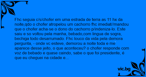 Fhc seguia c/s/chofer em uma estrada de terra as 11 hx da noite,qdo o chofer atropelou um сасhоrrо fhc imediat//mandou que o chofer acha-se o dono do сасhоrrо p/indeniza-lo. Este saiu e so voltou pela manha, bebado,com lingua de sogra, bechiga todo desarrumado. Fhc louco da vida pela demora pergunta, - onde vc esteve, demorou a noite toda e me aparece desse jeito, o que aconteceu? o chofer responde com voz de bebado e quase caindo, sabe o que foi presidente, é que eu cheguei na cidade e falei, ô pessoal é o seguinte eu sou motorista do fhc e eu matei o сасhоrrо, pronto não me deixaram falar mais nada, foi festa a noite inteira.