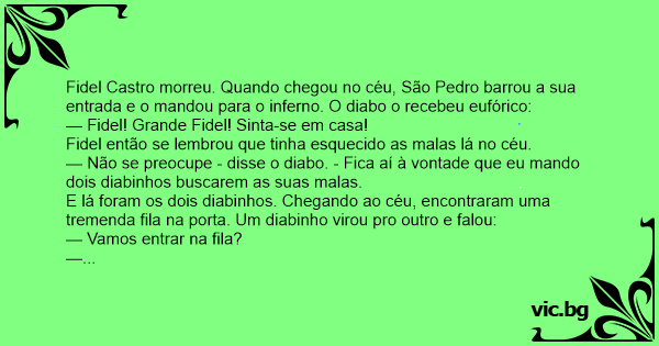 Fidel Castro morreu. Quando chegou no céu, São Pedro barrou a sua entrada e o mandou para o inferno. O diabo o recebeu eufórico: