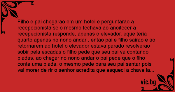 Filho e pai chegarao em um hotei e perguntarao a recepecionista se o mesmo fechava ao anoitecer a recepecionista responde, apenas o elevador. eque teria quarto apenas no nono andar , entao pai e filho sairao e ao retornarem ao hotel o elevador estava parado resolverao sobir pela escadas o filho pede que seu pai va contando piadas, ao chegar no nono andar o pai pede que o flho conte uma piada, o mesmo pede para seu pai sentar pois vai morer de rir o senhor acredita que esqueci a chave la enbaixo na portaria