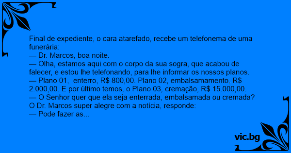 — O Senhor quer que ela seja enterrada, embalsamada ou cremada? O Dr. Marcos super alegre com a notícia, responde: