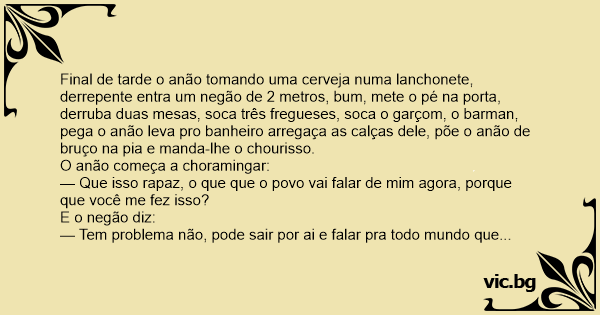 Final de tarde o anão tomando uma cerveja numa lanchonete, derrepente entra um negão de 2 metros, вuм, mete o pé na porta, derruba duas mesas, soca três fregueses, soca o garçom, o barman, pega o anão leva pro banheiro arregaça as calças dele, põe o anão de bruço na pia e manda-lhe o chourisso.