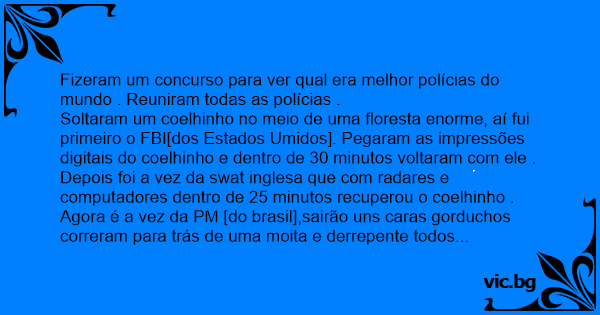 Soltaram um coelhinho no meio de uma floresta enorme, aí fui primeiro o FBI[dos Estados Umidos]. Pegaram as impressões digitais do coelhinho e dentro de 30 minutos voltaram com ele . Depois foi a vez da swat inglesa que com radares e computadores dentro de 25 minutos recuperou o coelhinho . Agora é a vez da PM [do brasil],sairão uns caras gorduchos correram para trás de uma moita e derrepente todos começaram a ouvir uns barulhos de socos e quando sai um PM segurando um porquinho e o porquinho gritando :