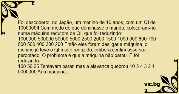 Foi descoberto, no Japão, um menino de 10 anos, com um QI de 1000000!! Com medo de que dominasse o mundo, colocaram-no numa máquina redutora de QI, que foi reduzindo: