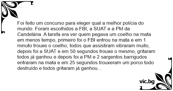 Foi feito um concurso para eleger qual a melhor polícia do mundo. Foram escolhidos a FBI, a SUAT e a PM da Candelária. A tarefa era ver quem pegava um coelho na mata em menos tempo, primeiro foi o FBI entrou na mata e em 1 minuto trouxe o coelho, todos que assistiram vibraram muito, depois foi a SUAT e em 50 segundos trouxe o mesmo, gritaram todos já ganhou e depois foi a PM e 2 sargentos barrigudos entraram na mata e em 25 segundos trouxeram um роrсо todo destruído e todos gritaram já ganhou , já ganhou e os organizadores do evento falaram para os РМs era para pegar um coelho e não um роrсо e o sargento olhou para o роrсо e ele respondeu eu juro que sou coelho .