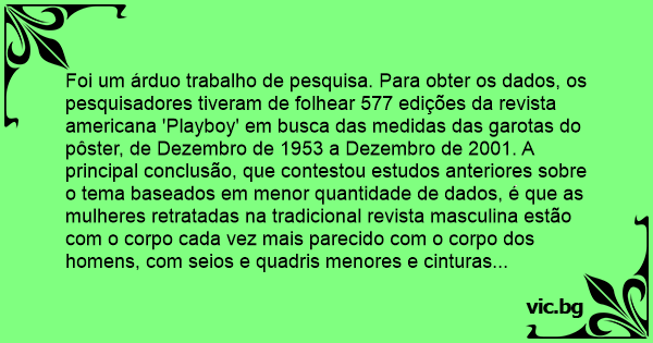 Foi um árduo trabalho de pesquisa. Para obter os dados, os pesquisadores tiveram de folhear 577 edições da revista americana 'Рlаyвоy' em busca das medidas das garotas do pôster, de Dezembro de 1953 a Dezembro de 2001. A principal conclusão, que contestou estudos anteriores sobre o tema baseados em menor quantidade de dados, é que as mulheres retratadas na tradicional revista masculina estão com o corpo cada vez mais parecido com o corpo dos homens, com seios e quadris menores e cinturas maiores. O estudo foi feito por Martin Voracek, da Universidade de Viena, Áustria, e Maryanne Fisher, da Universidade York, de Toronto, Canadá, e está publicado na última edição da revista médica britânica 'British Medical Journal'.