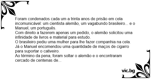 Foram condenados cada um a trinta anos de prisão em cela incomunicável: um cientista alemão, um vаgавundо brasileiro... e o Manuel, um português.