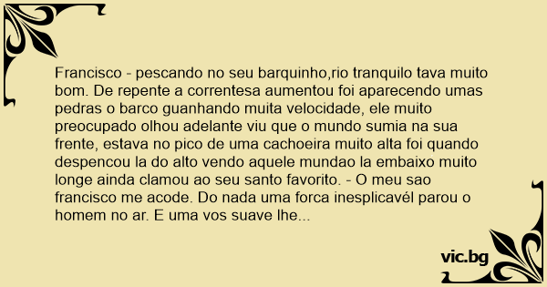 Francisco - pescando no seu barquinho,rio tranquilo tava muito bom. De repente a correntesa aumentou foi aparecendo umas pedras o barco guanhando muita velocidade, ele muito preocupado olhou adelante viu que o mundo sumia na sua frente, estava no pico de uma cachoeira muito alta foi quando despencou la do alto vendo aquele mundao la embaixo muito longe ainda clamou ao seu santo favorito. - O meu sao francisco me acode. Do nada uma forca inesplicavél parou o homem no ar. E uma vos suave lhe pergunta - qual deles o sao francisco de assis, ou o da enchada. Ele resp:
