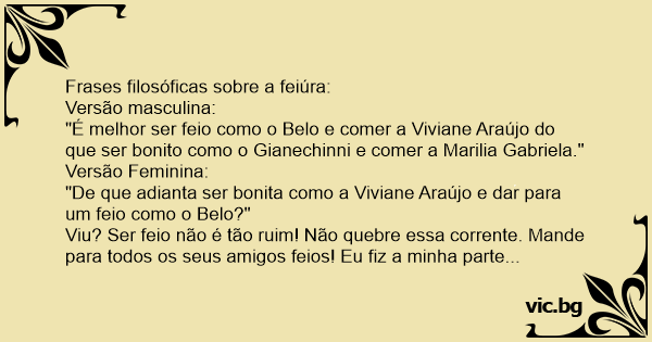 Viu? Ser feio não é tão ruim! Não quebre essa corrente. Mande para todos os seus amigos feios! Eu fiz a minha parte...