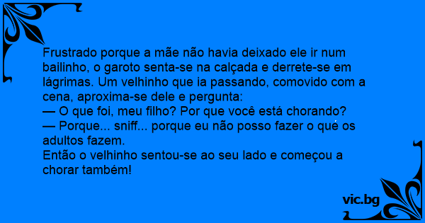 Frustrado porque a mãe não havia deixado ele ir num bailinho, o garoto senta-se na calçada e derrete-se em lágrimas. Um velhinho que ia passando, comovido com a cena, aproxima-se dele e pergunta: