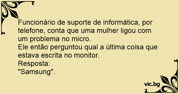 Funcionário de suporte de informática, por telefone, conta que uma mulher ligou com um problema no micro.