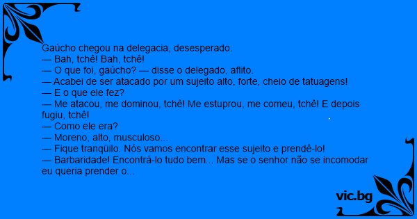 — Me atacou, me dominou, tchê! Me estuprou, me comeu, tchê! E depois fugiu, tchê!