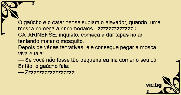 O gaúcho e o catarinense subiam o elevador, quando uma mosca começa a encomodálos - zzzzzzzzzzzzz O CATARINENSE, inquieto, começa a dar tapas no ar tentando matar o mosquito.