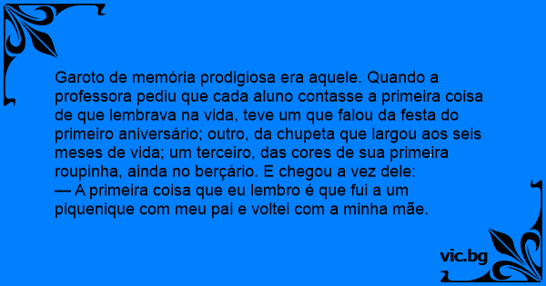 Garoto de memória prodigiosa era aquele. Quando a professora pediu que cada aluno contasse a primeira coisa de que lembrava na vida, teve um que falou da festa do primeiro aniversário; outro, da chupeta que largou aos seis meses de vida; um terceiro, das cores de sua primeira roupinha, ainda no berçário. E chegou a vez dele:
