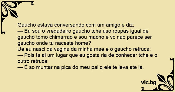 — Eu sou o vredadeiro gaucho tche uso roupas igual de gaucho tomo chimarrao e sou macho e vc nao parece ser gaucho onde tu naceste home?