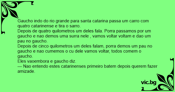 Depois de quatro quilometros um deles fala. Роrrа passamos por um gaucho e nao demos uma surra nele , vamos voltar voltam e dao um раu no gaucho.