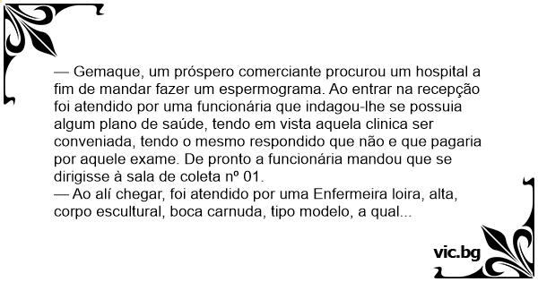 — Gemaque, um próspero comerciante procurou um hospital a fim de mandar fazer um espermograma. Ao entrar na recepção foi atendido por uma funcionária que indagou-lhe se possuia algum plano de saúde, tendo em vista aquela clinica ser conveniada, tendo o mesmo respondido que não e que pagaria por aquele exame. De pronto a funcionária mandou que se dirigisse à sala de coleta nº 01.