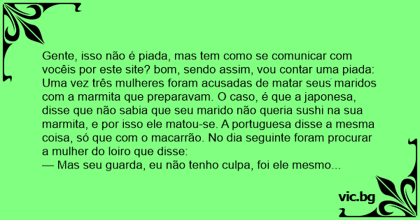 Uma vez três mulheres foram acusadas de matar seus maridos com a marmita que preparavam. O caso, é que a japonesa, disse que não sabia que seu marido não queria sushi na sua marmita, e por isso ele matou-se. A portuguesa disse a mesma coisa, só que com o macarrão. No dia seguinte foram procurar a mulher do loiro que disse:
