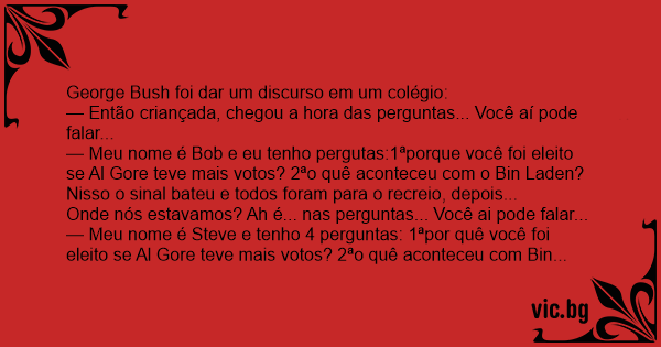 — Meu nome é Bob e eu tenho pergutas:1ªporque você foi eleito se Al Gore teve mais votos? 2ªo quê aconteceu com o Bin Laden?
