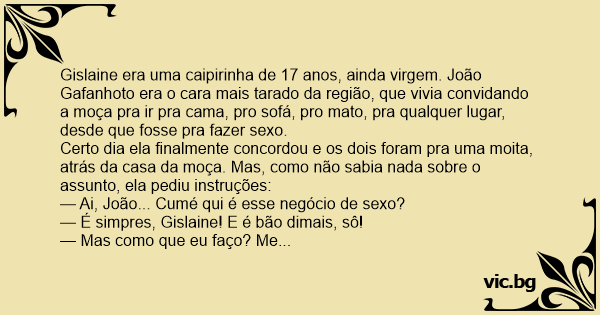 Gislaine era uma caipirinha de 17 anos, ainda virgem. João Gafanhoto era o cara mais таrаdо da região, que vivia convidando a moça pra ir pra cama, pro sofá, pro mato, pra qualquer lugar, desde que fosse pra fazer sеxо.