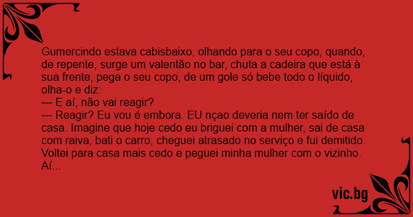 Gumercindo estava cabisbaixo, olhando para o seu copo, quando, de repente, surge um valentão no bar, chuta a cadeira que está à sua frente, pega o seu copo, de um gole só bebe todo o líquido, olha-o e diz: