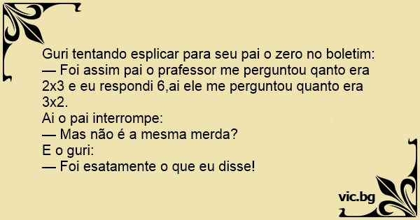 — Foi assim pai o prafessor me perguntou qanto era 2x3 e eu respondi 6,ai ele me perguntou quanto era 3x2.