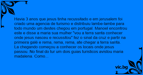 Havia 3 anos que jesus tinha recussitado e em jerusalem foi criado uma agencia de turismo e distribuiu lambe-lambe para todo mundo um destes chegou em portugal. Manoel encontrou este e disse a maria sua mulher "vou a terra santa conhecer onde jesus nasceu e recussitou" fez o sinal da cruz e partir na primeira galé e rema, rema, rema, ate chegar a terra santa.