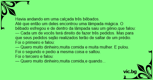 Até que então um deles encontrou uma lâmpada mágica. O bêbado esfregou e de dentro da lâmpada saiu um gênio,que falou: