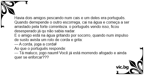 Havia dois amigos pescando num cais e um deles era português. Quando derrepende o outro escorrega, cai na água e começa a ser arrastado pela forte correnteza. o português vendo isso, ficou desesperado já qu não sabia nadar.