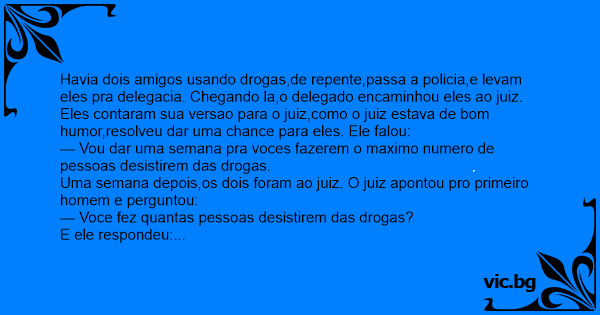 Havia dois amigos usando drogas,de repente,passa a policia,e levam eles pra delegacia. Chegando la,o delegado encaminhou eles ao juiz. Eles contaram sua versao para o juiz,como o juiz estava de bom humor,resolveu dar uma chance para eles. Ele falou: