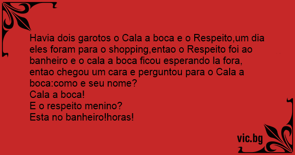 Havia dois garotos o Cala a boca e o Respeito,um dia eles foram para o shopping,entao o Respeito foi ao banheiro e o cala a boca ficou esperando la fora, entao chegou um cara e perguntou para o Cala a boca:como e seu nome?