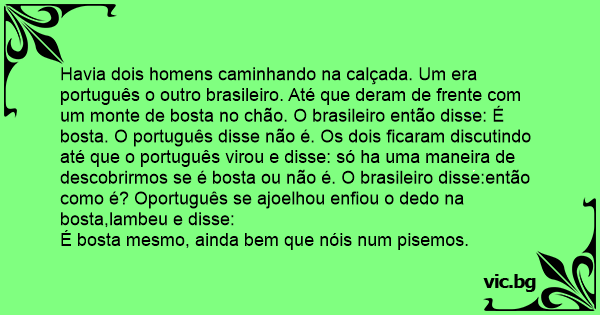 Havia dois homens caminhando na calçada. Um era português o outro brasileiro. Até que deram de frente com um monte de bosta no chão. O brasileiro então disse: É bosta. O português disse não é. Os dois ficaram discutindo até que o português virou e disse: só ha uma maneira de descobrirmos se é bosta ou não é. O brasileiro disse:então como é? Oportuguês se ajoelhou enfiou o dedo na bosta,lambeu e disse: