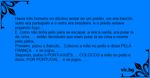 Havia três homens no décimo andar de um prédio, um era francês, outro era português e o outro era brasileiro, e o prédio estava pegando fogo....